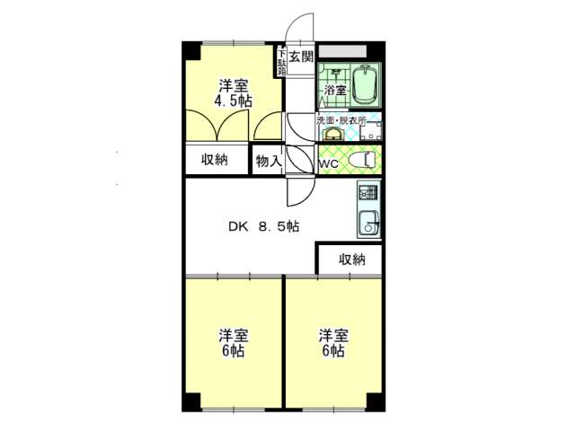 | 詳細間取 | 3DK (洋6帖×1、洋6帖×1、洋4.5帖×1、DK8.5帖) | ||
